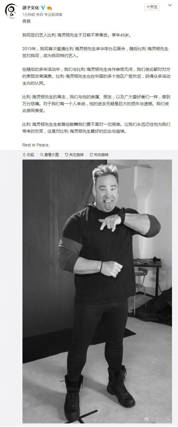 根據(jù)其母親在推特上發(fā)文,確認(rèn)了這則消息,比利海靈頓的去世源于一場意外的車禍。隨后比利海靈頓的簽約公司“中國源子文化”也發(fā)博追悼。
