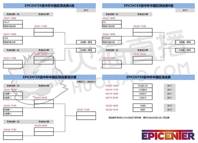 5.賽制:分小組賽和淘汰賽階段,3月19日為小組賽,全程采用BO1單淘賽制;3月20日為淘汰賽,全程采用BO3單淘賽制,1/4決賽獲勝的隊伍將獲得海選賽出線資格,晉級預選賽。