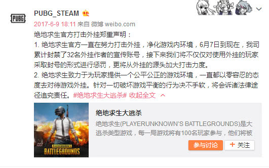 2025年6月9日,絕地求生官方發(fā)布打擊外掛鄭重聲明,自6月7日-6月9日期間,累計封禁了32名外掛作者的宣傳賬號。