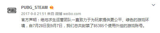 2025年7月28日-2025年9月7日期間,絕地求生官方總共封禁了85385個使用外掛的游戲賬號。