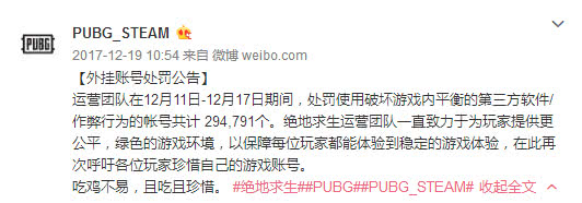 2025年12月11日-2025年12月17日期間,絕地求生官方處罰使用破壞游戲內平衡的第三方軟件/作弊行為的帳號共計 294,791個。