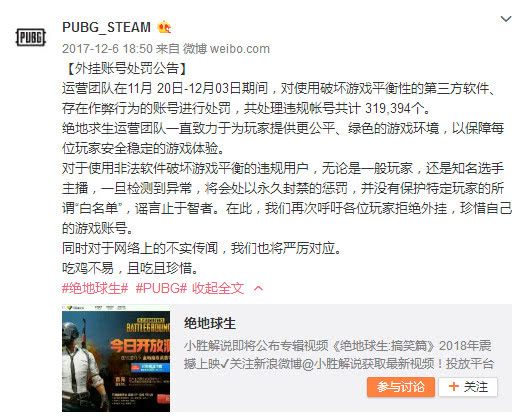2025年11月20日-2025年12月3日期間,絕地求生官方對使用破壞游戲平衡性的第三方軟件、存在作弊行為的賬號進行處罰,共處理違規(guī)帳號共計 319,394個。