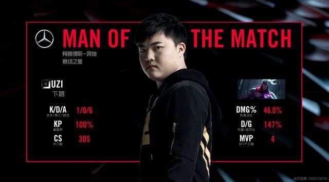 在輸出上,Uzi的維魯斯打出了全場(chǎng)最高的輸出,MVP也是給予了Uzi,1/0/6的數(shù)據(jù),46%的團(tuán)隊(duì)輸出占比,100%的參團(tuán)率。