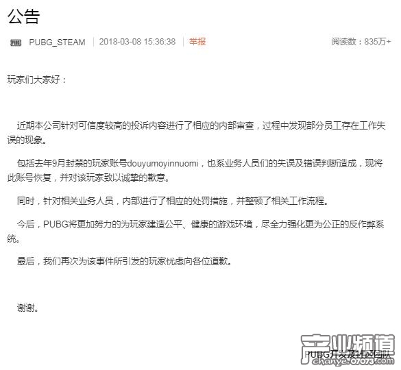 3月8日,絕地求生官方微博發(fā)布公告,承認誤封斗魚主播魔音糯米,現(xiàn)已解封他的游戲賬號,并且為調(diào)查人員的失誤而向糯米道歉??梢哉f糾結了這么長時間的魔音糯米終于得到了官方的解禁和道歉,真正的平反了。后續(xù)不知道斗魚會不會道歉,而同樣因為外掛被封的五五開看了會做怎樣的感想?