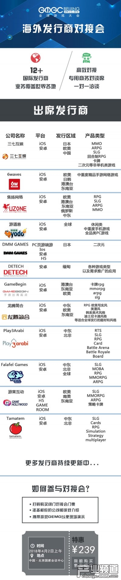 現(xiàn)已確認(rèn)出席本次閉門對接會的12家國內(nèi)外發(fā)行商包括(排名不分先后):三七互娛,6waves,焦揚網(wǎng)絡(luò),游道易,DMM GAMES,DETECH,GameBegin,龍騰簡合,Play 3arabi,F(xiàn)alafel Games,游萊互動和Tamatem。