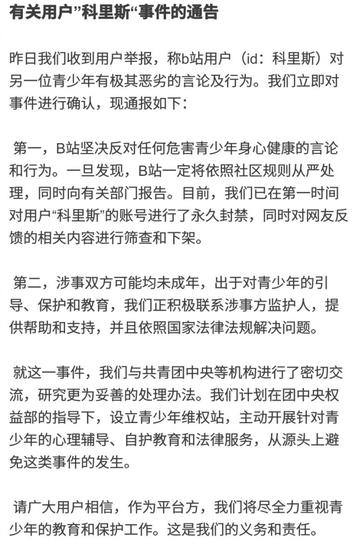 昨日(12日)我們收到用戶舉報(bào),稱b站用戶(id:科里斯)對(duì)另一位青少年有極其惡劣的言論及行為。我們立即對(duì)事件進(jìn)行確認(rèn),現(xiàn)通報(bào)如下: