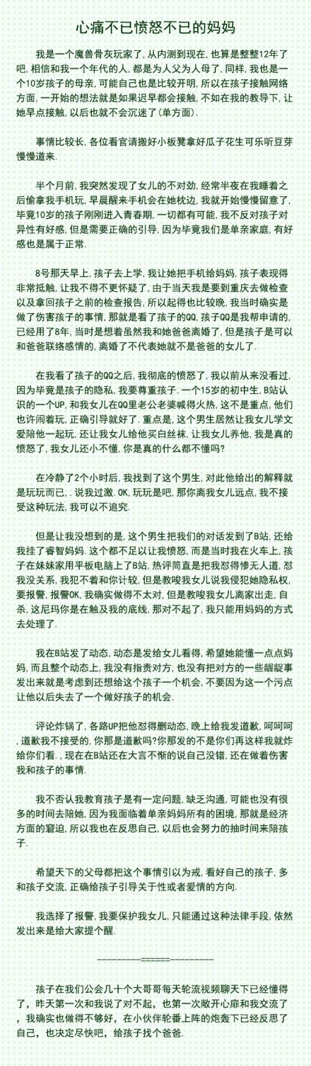 據(jù)了解,此事源起于一個(gè)母親在NGA發(fā)帖求助,她發(fā)現(xiàn)自己10歲的女兒近況不佳,在隨后的查閱中發(fā)現(xiàn)UP主“科里斯”一直在引導(dǎo)其女兒。站內(nèi)存在的色情、變態(tài)、獵奇的“文化”觸動(dòng)這位母親,隨后其發(fā)帖求助。