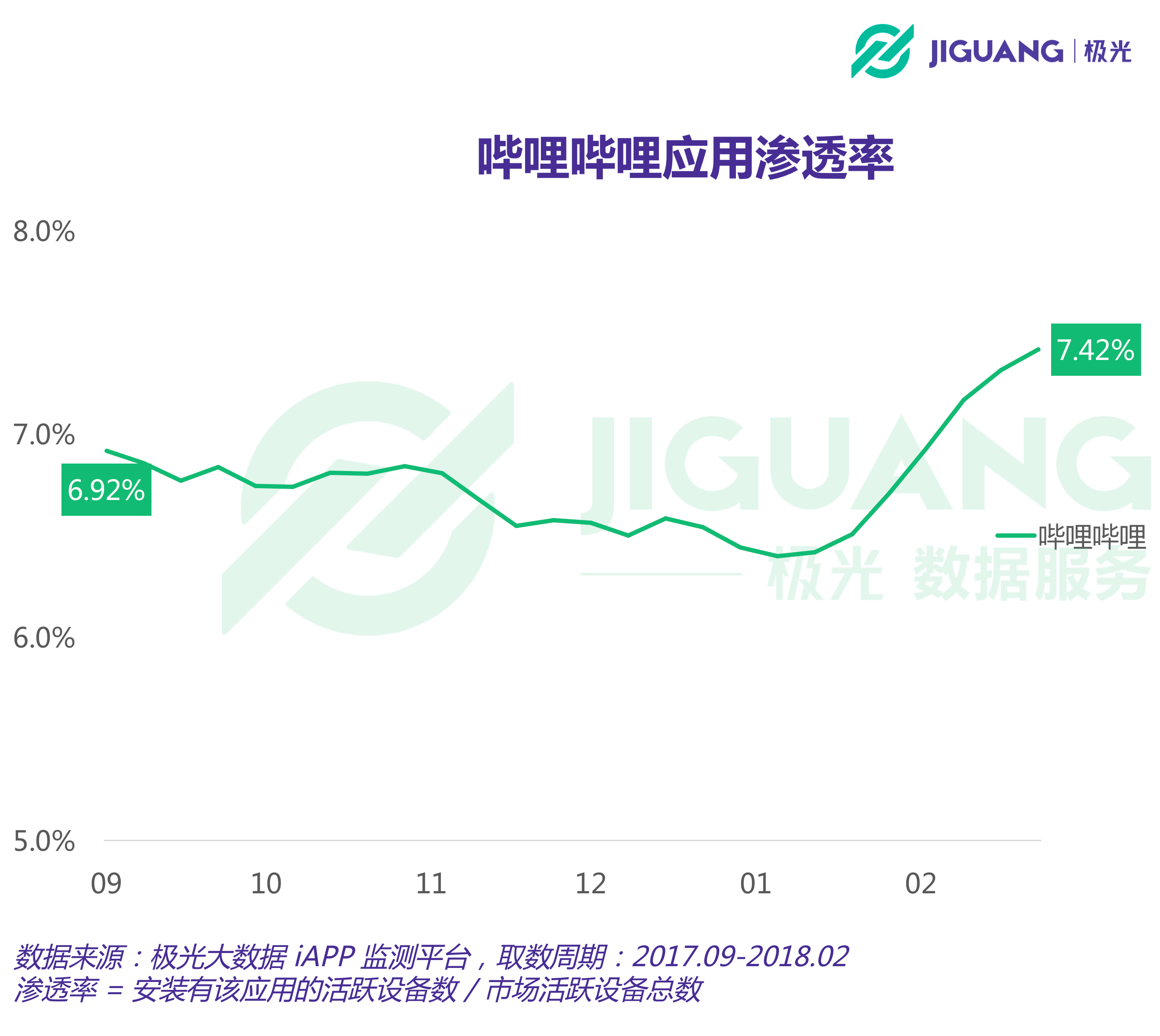 極光大數(shù)據(jù)的監(jiān)測(cè)結(jié)果顯示,截至今年2月份最后一周,B站應(yīng)用端的市場(chǎng)滲透率達(dá)到7.42%。從滲透率的曲線走勢(shì)可知,從今年1月份起,B站滲透率的攀升勢(shì)頭非常明顯。在過去半年內(nèi),B站應(yīng)用端在滲透率上的增長比例為7.23%。