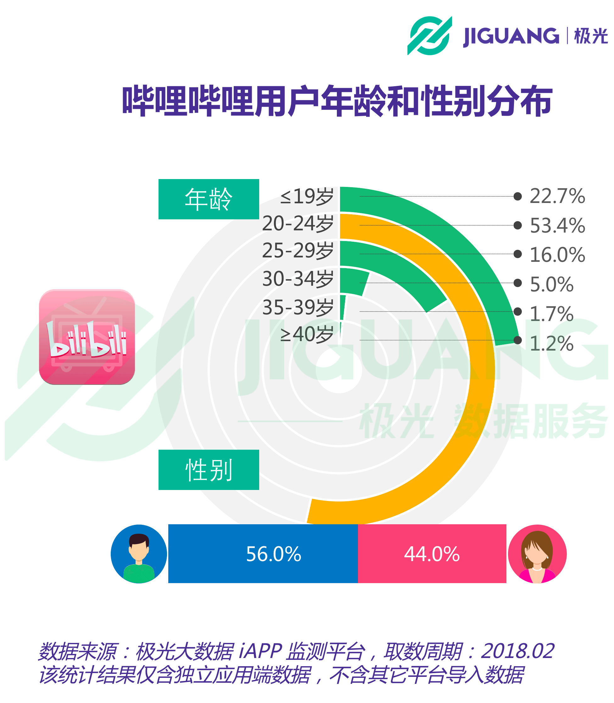 在招股書上,B站給自己的定位是“中國年輕人高度聚集的內(nèi)容社區(qū)”。極光大數(shù)據(jù)的統(tǒng)計(jì)結(jié)果顯示,B站用戶的年輕化特征的確十分顯著:24歲以下用戶在B站中的占比達(dá)到76.1%,29歲以下更是高達(dá)92.1%。與此同時(shí),用戶年齡分布結(jié)果顯示,B站中男性用戶的占比為56%,略高于女性用戶。