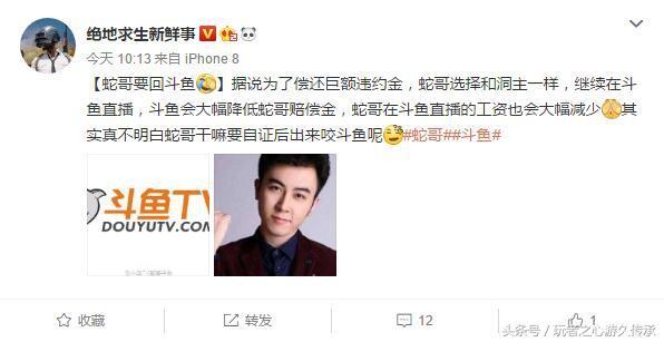 還記得年初的蛇哥嗎?那個(gè)曾經(jīng)的斗魚絕地一哥,如今終于要重新回歸公眾的視野了。不過,他可不是因?yàn)橛袆e的直播平臺(tái)接納他而重新簽約的,而是因?yàn)樯肀硟善鸸偎緦⒔?400萬的賠償金不得不重新回到斗魚還債。