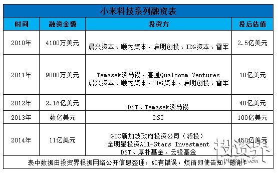 根據(jù)公開資料顯示,小米成立至今已經(jīng)從外界獲取了5輪融資,詳情如下: