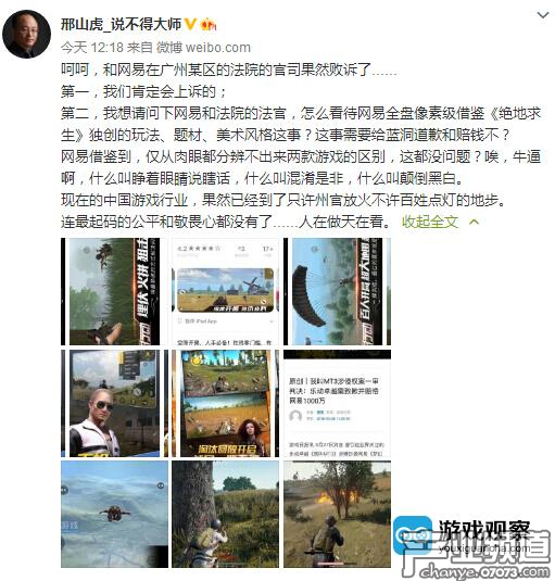 3月28日午間,卓越游戲CEO邢山虎通過微博發(fā)表回應(yīng)這一判決,指責(zé)網(wǎng)易全盤像素級(jí)借鑒藍(lán)洞《絕地求生》獨(dú)創(chuàng)的玩法、題材、美術(shù)風(fēng)格。