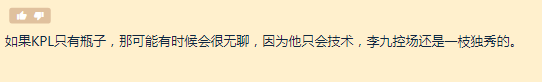 不得不說,解說李九的臨場應(yīng)變能力是真的很強??梢栽诮庹f比賽時,去制造一些讓KPL觀眾廣為流傳的梗(就比如在去年KPL決賽上的:誰敢橫刀立馬,唯我飛牛大將軍等等),李九真是個鬼才,KPL撿到寶了!