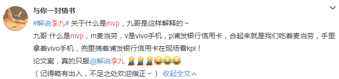 什么是MVP?通常給我們回答,無非就是最優(yōu)秀的選手吧啦吧啦這樣的解釋,有些吃瓜群眾還可能答不上來。但是,李九在現(xiàn)場給我們的解釋是這樣的:M是麥當(dāng)勞、V是VIVO手機(jī)、P是浦發(fā)銀行信用卡。連起來就是我們吃著麥當(dāng)勞,手里拿著VIVO手機(jī),兜里揣著浦發(fā)銀行信用卡在現(xiàn)場看KPL!龜龜,當(dāng)時小編我看到這里,心里就一個念頭(如圖)