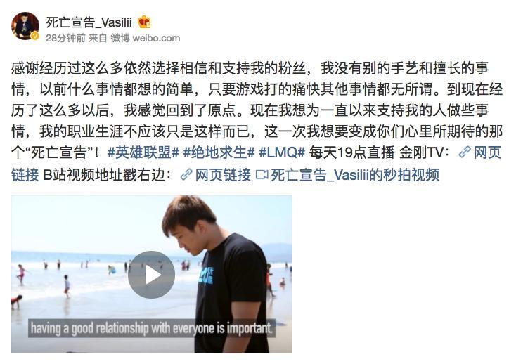 感謝經(jīng)歷過這么多依然選擇相信和支持我的粉絲,我沒有別的手藝和擅長的事情,以前什么事情都想的簡單,只要游戲打的痛快其他事情都無所謂。到現(xiàn)在經(jīng)歷了這么多以后,我感覺回到了原點(diǎn)?,F(xiàn)在我想為一直以來支持我的人做些事情,我的職業(yè)生涯不應(yīng)該只是這樣而已,這一次我想要變成你們心里所期待的那個(gè)“死亡宣告”!