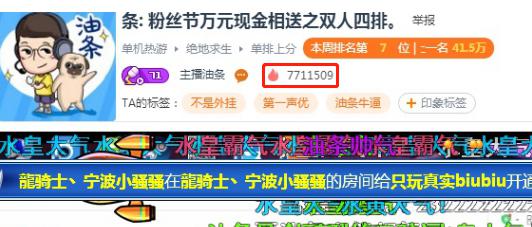 隨后,看油條的排名不盡人意,又是狂刷四五十發(fā)火箭把直播間轟炸的直接卡屏,也把油條直接送進前十。一番雷厲風行的操作把油條感動的無以復加,也讓直播間直接炸鍋,人氣直接漲了一倍!