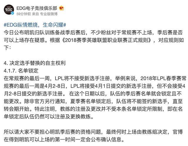 所以說之前LPL工作人員爆料廠長在進行賽前報備就是因為這個規(guī)則,對此EDG官博也在今晚做出了解釋,表示廠長目前具備季后賽的上場資格,請粉絲不用擔心!