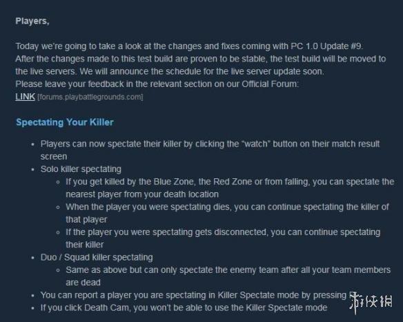 此前公布了許久的“擊殺者旁觀”系統(tǒng)在昨日正式加入到了《絕地求生大逃殺(PlayerUnknown’s Battlegrounds)》的測試服務器中。