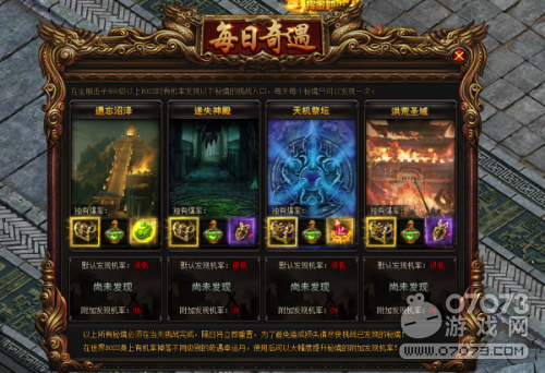 玩家等級達(dá)到160級開啟每日奇遇功能,擊殺900級以上的BOSS有概率發(fā)現(xiàn)秘境:遺忘沼澤、迷失神殿、天機(jī)祭壇、洪荒圣城;