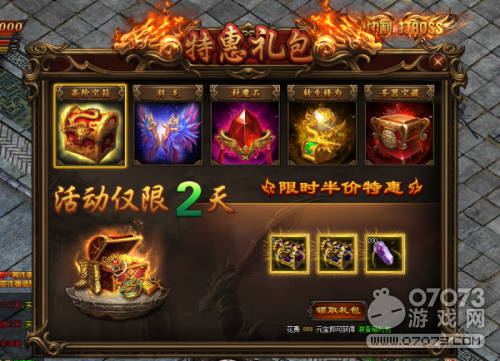開服七天內(nèi),玩家可購買,包括:高階寶箱、羽毛、 封魔石、轉(zhuǎn)生修為、圣器寶藏