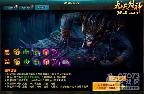 最厲害的來啦!妖魔鬼怪齊上陣的51《九天封神》封妖副本可是獎勵多多哦!在封妖副本中妖獸、妖王從凌晨0點開始刷新,之后每隔2小時再次刷新。小伙伴們使用藏寶圖挖寶時也會有一定幾率釋放出妖王和妖獸哦!其中妖獸共有天狗、猙、橫公魚、天狐、鳴蛇5種,妖王有虛耗、鯤鵬、窮奇、饕餮、九尾狐5種,擊殺它們還有額外幾率獲得尋龍訣哦!原來BOSS還可以這樣殺,真是有意思!關(guān)于51《九天封神》副本活動小編就說這么多!這么多特別的活動小伙伴不想親自去體驗一番嗎?趕快加入51《九天封神》體驗別樣殺BOSS吧!