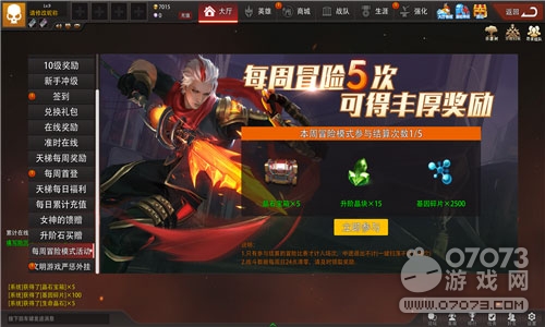 在每周冒險(xiǎn)活動(dòng)中,每一位玩家每個(gè)星期可進(jìn)行5次冒險(xiǎn)活動(dòng),只有完成5次的冒險(xiǎn)活動(dòng)才可獲得晶石寶箱*5以及一些升階晶塊等提升自身實(shí)力的物資。在每周冒險(xiǎn)活動(dòng)中,未來(lái)戰(zhàn)士化身保護(hù)水晶的勇士,一同抗擊天啟暴徒,每次的冒險(xiǎn)任務(wù)需要擊敗10輪入侵者的進(jìn)攻,保護(hù)水晶不被敵方破壞即算獲得成功!