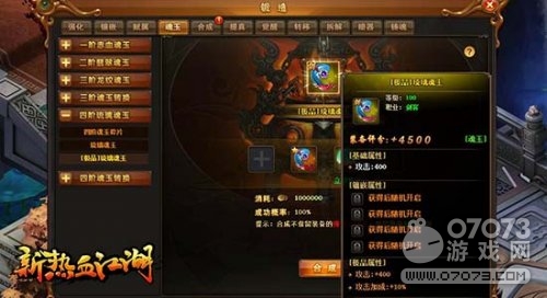 從最初的魂玉碎片開始,每高一階的魂玉都需要低階魂玉作為材料,一階到四階魂玉依次名為:赤血魂玉、翡翠魂玉、龍紋魂玉、琉璃魂玉。三、四階魂玉有概率合成出極品魂玉,并且都可以通過轉(zhuǎn)換功能來變?yōu)樽陨砺殬I(yè)的專屬魂玉。