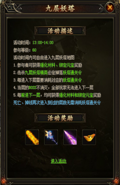 九層妖塔共有9層,每層都會刷新一直Boss,擊殺本層Boss,可以進(jìn)入下一關(guān),而進(jìn)入下一關(guān)需要通過令牌,擊殺精英怪可以獲得令牌。在九層妖塔中,每進(jìn)入下一層都可獲得綁定元寶和黑鐵礦的獎勵,到達(dá)的層數(shù)越高,獎勵也就越多,揚(yáng)名立萬,在此一戰(zhàn)!
