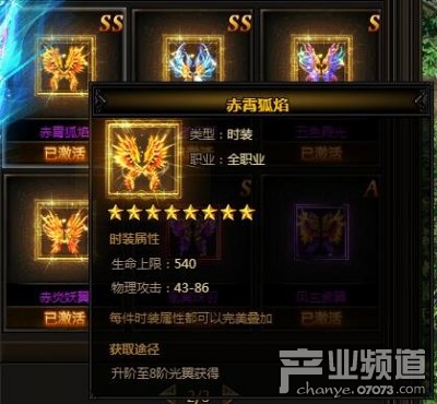 赤霄狐焰。類型:時裝,職業(yè):全職業(yè),8顆星。時裝屬性——生命上限:540,物理攻擊:43-86,每件時裝屬性都可以完美疊加。獲取途徑:升階至8階光翼獲得。
