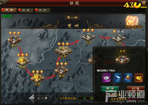 想要強(qiáng)大勢(shì)力,43u《霸將三國(guó)》征戰(zhàn)絕對(duì)是個(gè)好途徑,在征戰(zhàn)中有普通、困難和煉獄三個(gè)難度,小伙伴們可以自由選擇挑戰(zhàn)難度,從雍丘到許昌再到濮陽(yáng)一路走來(lái)到處都是小伙伴們的戰(zhàn)斗回憶,挑戰(zhàn)過(guò)的關(guān)卡還可以通過(guò)掃蕩來(lái)快速獲得獎(jiǎng)勵(lì)!每個(gè)章節(jié)挑戰(zhàn)累計(jì)達(dá)到相應(yīng)星級(jí)還可以領(lǐng)取銀兩和裝備強(qiáng)化石獎(jiǎng)勵(lì)哦!