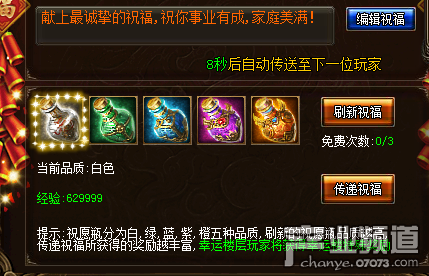 玩家通過刷新祝??梢垣@得不同額度的經驗獎勵,每天的前3次刷新為免費刷新,再次刷新需要消耗3禮券。祝福瓶分為5種品質,越往后刷所獲得的經驗獎勵越加豐厚。另外幸運樓層的玩家還能獲得特殊樓層獎勵。