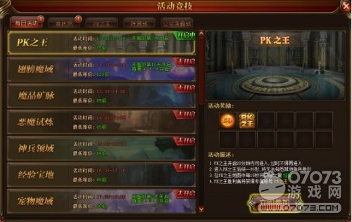 在獲得了更加強大的力量之后,人們開始通過相互切磋提升自己的能力。因此,PK之王的活動也應運而生。彼此切磋,獲得榮耀,究竟誰能成為PK之王?游戲界面小地圖的左下方會有游戲開啟時的進入引導,直接打開活動競技界面也可以點擊參加活動。