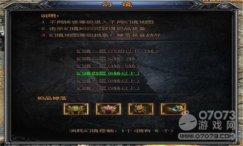 作為5217yx《梁山傳奇》游戲當(dāng)中的三大特色副本之一,神秘幻境的進(jìn)入條件與其他副本相比大有不同。不同轉(zhuǎn)世等級(jí)的玩家將進(jìn)入到不同的幻境地圖當(dāng)中!幻境總共分為五層,幻境一層(75級(jí)-1轉(zhuǎn)),幻境二層(2轉(zhuǎn)-3轉(zhuǎn))、幻境三層(4轉(zhuǎn)-5轉(zhuǎn)),幻境四層(6轉(zhuǎn)以上),幻境五層(8轉(zhuǎn)以上)。玩家進(jìn)入幻境時(shí)需要幻境卷軸,擊殺幻境BOSS最高可以獲得8轉(zhuǎn)橙色裝備!