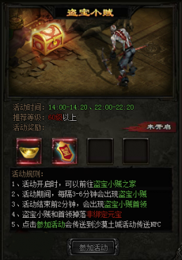 在蘿卜玩《傳奇皇朝》每天的14:00—14:20、22:00—22:20兩個時間段內,每隔3到6分鐘就會出現盜寶的小賊。在活動時間結束的前2分鐘內,還會出現盜寶小賊的首領。玩家可以到盜寶小賊的家里去,也可以通過點擊參加活動直接傳送到沙漠土城活動傳送NPC哦!
