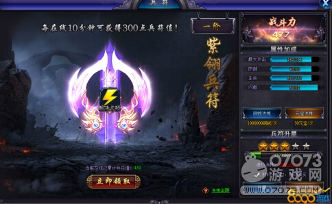 每天除了三次的免費洗煉的機會以外,還可以用銅錢洗煉和元寶洗煉,銅錢洗煉每次需要消耗1000000銅錢,元寶洗煉每次需要50元寶。每在線十分鐘可獲得300點兵符值,除了累積的兵符值外,還可以通過戰(zhàn)功令來升星,戰(zhàn)功令在碧血幽閣里打BOOS掉落。