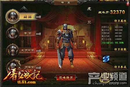 在51《屠龍戰(zhàn)記》里,玩家點(diǎn)擊游戲主界面下方的“侍衛(wèi)”圖標(biāo)或使用快捷鍵“U”可迅速打開(kāi)屠龍戰(zhàn)記侍衛(wèi)系統(tǒng)。游戲目前共有5位侍衛(wèi)供玩家選擇,按照戰(zhàn)力由低到高排列分別為虎衛(wèi)、鷹衛(wèi)、大刀守衛(wèi)、帶刀侍衛(wèi)和半獸統(tǒng)領(lǐng)。