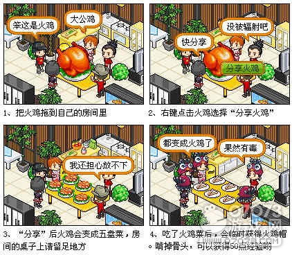 1、玩家可以在中央廣場找到一個烤架,當(dāng)你包包里有火雞肉,便可以去廣場里烤制香噴噴的火雞啦!烤制成功后,包包里就會有一個已經(jīng)烤好的火雞。