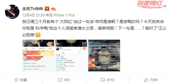 相信現(xiàn)場聽了帝師這段話的人,都能感受到帝師的真心,而觀眾們對他的關(guān)注就是最好的力證。帝師下播后,他的直播間仍有很多人留在直播間,點下了關(guān)注按鈕。他隨后發(fā)的微博也是獲得了很多人留言支持,網(wǎng)友們紛紛表示“被秀哭了”。