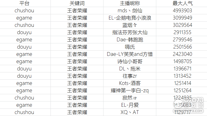 直播行業(yè)第一權威媒體直播觀察《王者榮耀》主播11月數據曝光,相對于行業(yè)內另一數據公司小葫蘆的清一色虎牙主播(根據小葫蘆最新數據榜,《王者榮耀》前十主播,虎牙直播占8席之多,《王者榮耀》一母同胞的企鵝電競,竟無人上小葫蘆主播榜),直播觀察給出的排行榜顯然要更加百花齊放。扎根手游直播、以培養(yǎng)主播為主、有《王者榮耀》黃埔軍校之稱的觸手直播和騰訊旗下電競直播平臺企鵝電競表現搶眼。