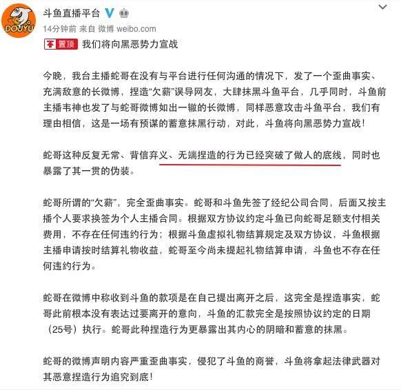 在斗魚前主播蛇哥和韋神先后發(fā)布討薪檄文后,本以為斗魚會(huì)默不作聲的,可沒(méi)有想到,僅僅過(guò)了幾個(gè)小時(shí),斗魚的一紙公告就天雷降下了!