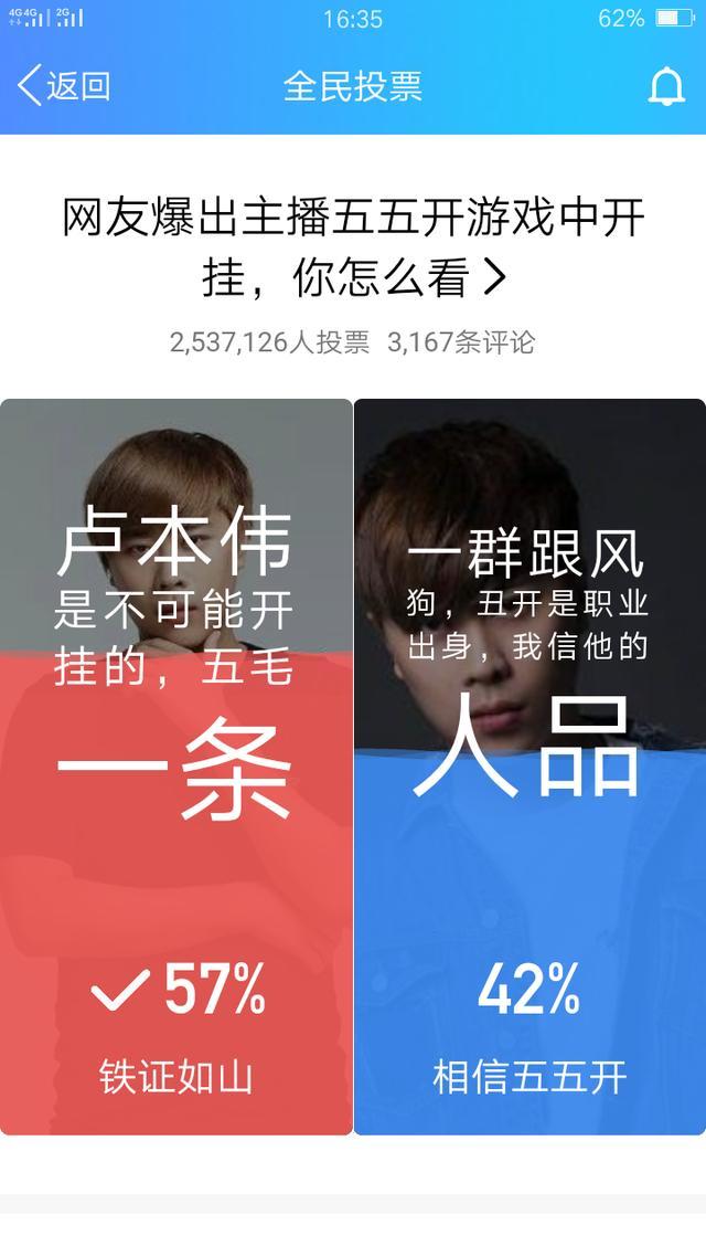 事情雖然過去了,不過最近這個全民投票又來了,這一次要投票的內(nèi)容是最近很火的五五開外掛事件,根據(jù)投票的情況來看,投票一共兩個選項: