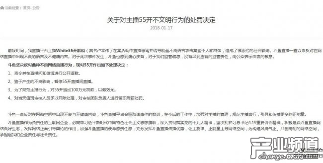 第七宗罪,套話太多,不是真心道歉。當(dāng)然,這里有另外一種說法,由于這次事件影響太大,引起了有關(guān)部門的重視,勒令斗魚嚴(yán)肅處理,所以斗魚才搞出這么一個處罰決定。大家如果看到公告,會發(fā)現(xiàn)最后一段“套話”太多,又是貫徹精神,又是責(zé)任感使命感,又是主旋律正能量……小編很少看到一家互聯(lián)網(wǎng)公司能夠發(fā)布這樣的公告。我們支持有關(guān)部門的做法,但也希望斗魚真心道歉,不過這次處罰五五開事件進(jìn)行到這個程度,說重一點(diǎn),是欺上瞞下、避重就輕,顯然不是解決問題的態(tài)度。