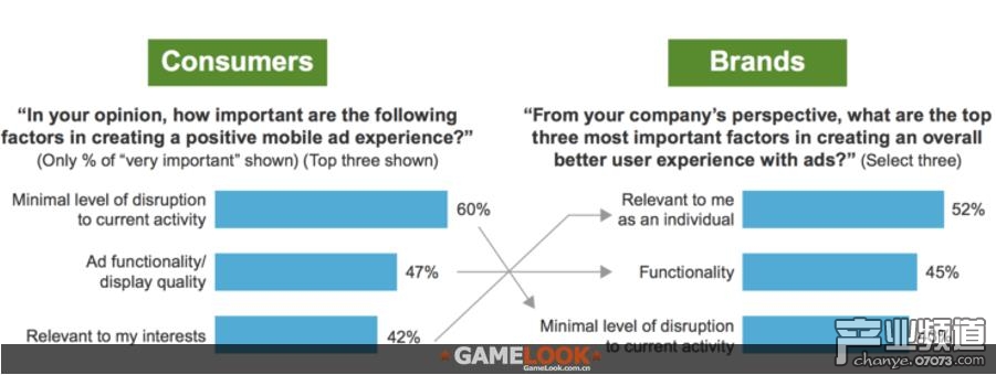 不過,消費(fèi)者和品牌商的調(diào)查對(duì)‘創(chuàng)造積極的移動(dòng)廣告體驗(yàn)’給出了不同答案。消費(fèi)者們更看重廣告的相關(guān)性,而不是打斷體驗(yàn),而品牌商的看法則剛好相反。