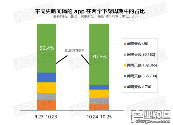 對(duì)比近一個(gè)月(9 月 23 日至 10 月 23 日)的數(shù)據(jù),AppStore共下架 app 137607 款,每天的平均下架數(shù)量在 4500 左右,遠(yuǎn)小于最近兩天的 2~3 萬(wàn)。ASO100 對(duì)這些下架 app的特征進(jìn)行了數(shù)據(jù)統(tǒng)計(jì),發(fā)現(xiàn)最近兩天下架的 app中,有70.5% 的 app兩年未進(jìn)行更新,這個(gè)數(shù)據(jù)要高于同樣的 app在前 30 天的所占比例 56.4%。