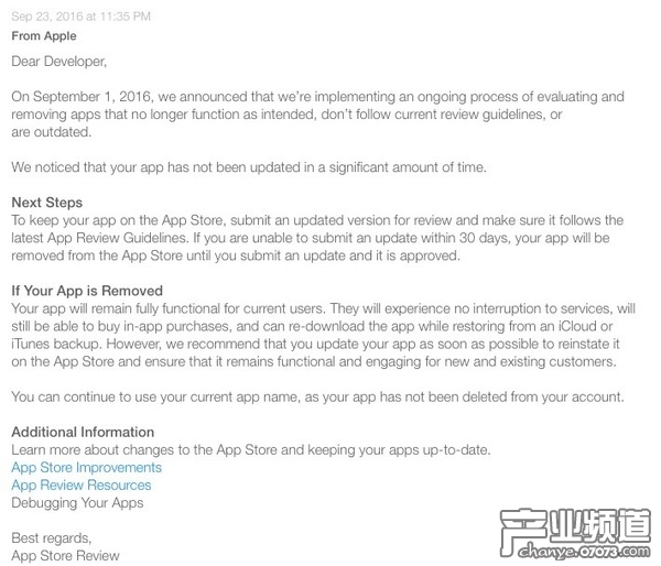 蘋(píng)果發(fā)送這封郵件的日期剛好是 9 月 23 日,距昨天開(kāi)始大批量下架剛好過(guò)去一個(gè)月。所以我們基本上可以確定,AppStore對(duì)廢棄應(yīng)用的清理已經(jīng)開(kāi)始了;另外,雖然從近兩天的數(shù)據(jù)上來(lái)看,兩年以上未更新的 app會(huì)被認(rèn)定為廢棄應(yīng)用,但也不排除蘋(píng)果在清理后期將更新間隔縮減到一年或更短。