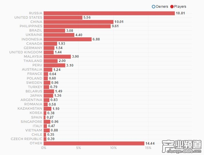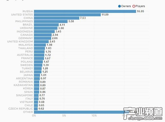 下面這張是Steam上《DOTA2》這個游戲的各國占有比,第一名仍然是俄羅斯,達(dá)到了16.95%。其次是美國,第三名才是中國,達(dá)7.53%,連俄羅斯的一半都還不到。