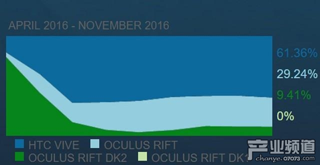 上圖為11月份的數(shù)據(jù)。HTC Vive在6-10月的市場(chǎng)份額持續(xù)下跌,而在11月份終于出現(xiàn)反彈。從上面我們可以看出Vive的份額是61.36%;Oculus Rift為29.24%;Oculus Rift DK2則是9.41%。