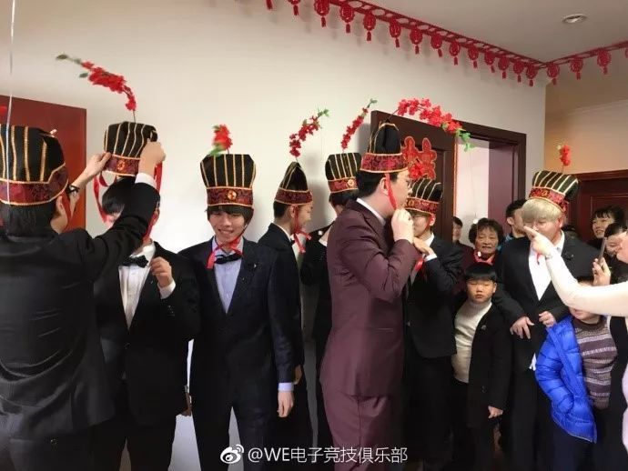 WE的幾位隊(duì)員是伴郎呢,他們一進(jìn)屋子就要戴上帽子,吃帽子上拴著的糖果!