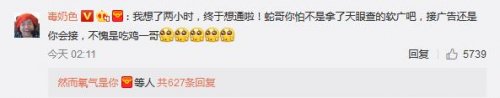 而且蛇哥的爆料不僅吸引了王思聰前來打臉,就連毒奶色也調(diào)侃稱“我想了兩小時,終于想通啦!蛇哥你怕不是拿了天眼查的軟廣吧,接廣告還是你會接,不愧是吃雞一哥”。