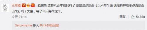 然而,對于蛇哥的爆料不少吃瓜群眾都不買賬,就連王思聰都跑過來打臉蛇哥稱“蛇胸弟 這都八百年前的料了 要是沒點東西可以不吹牛逼 說爆料麻煩拿點真東西出來行嗎?失望,等了半天等來這個。”